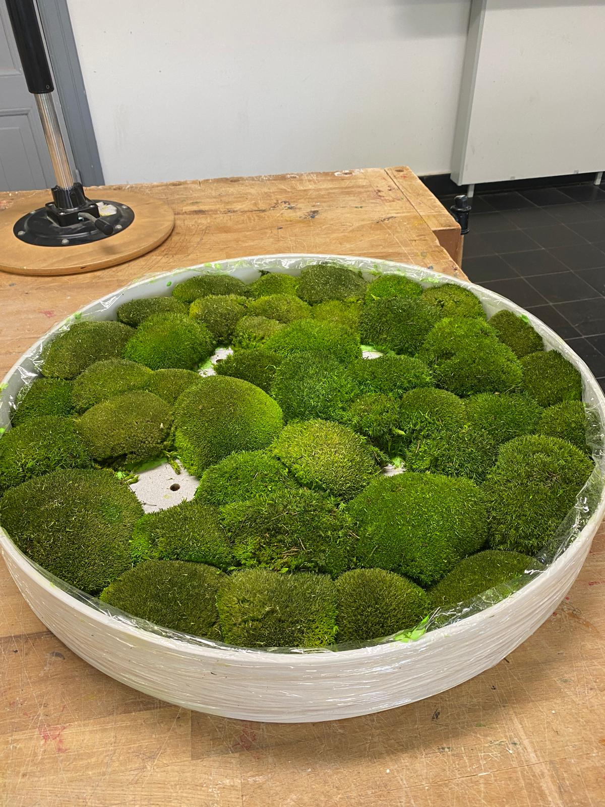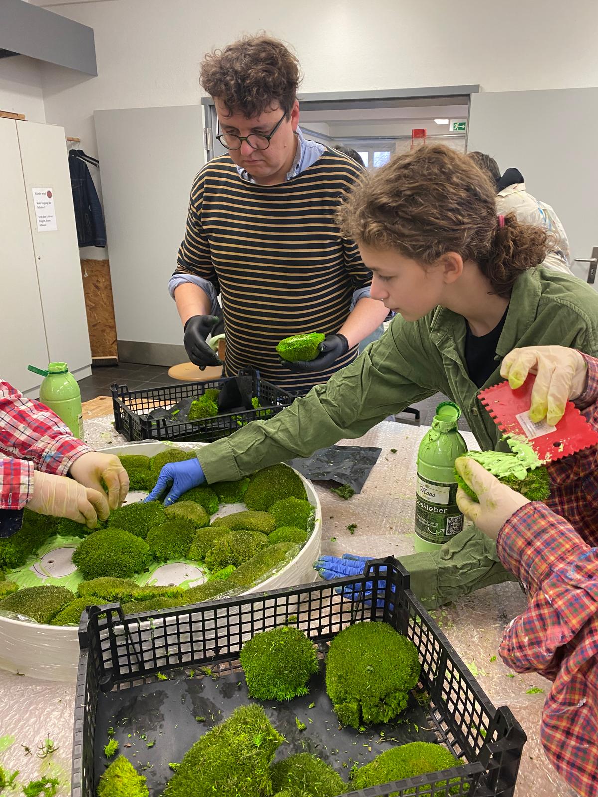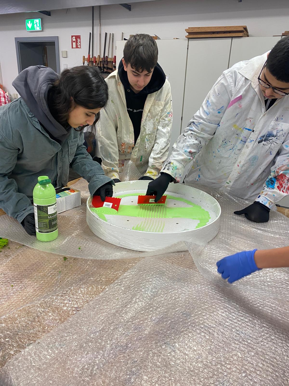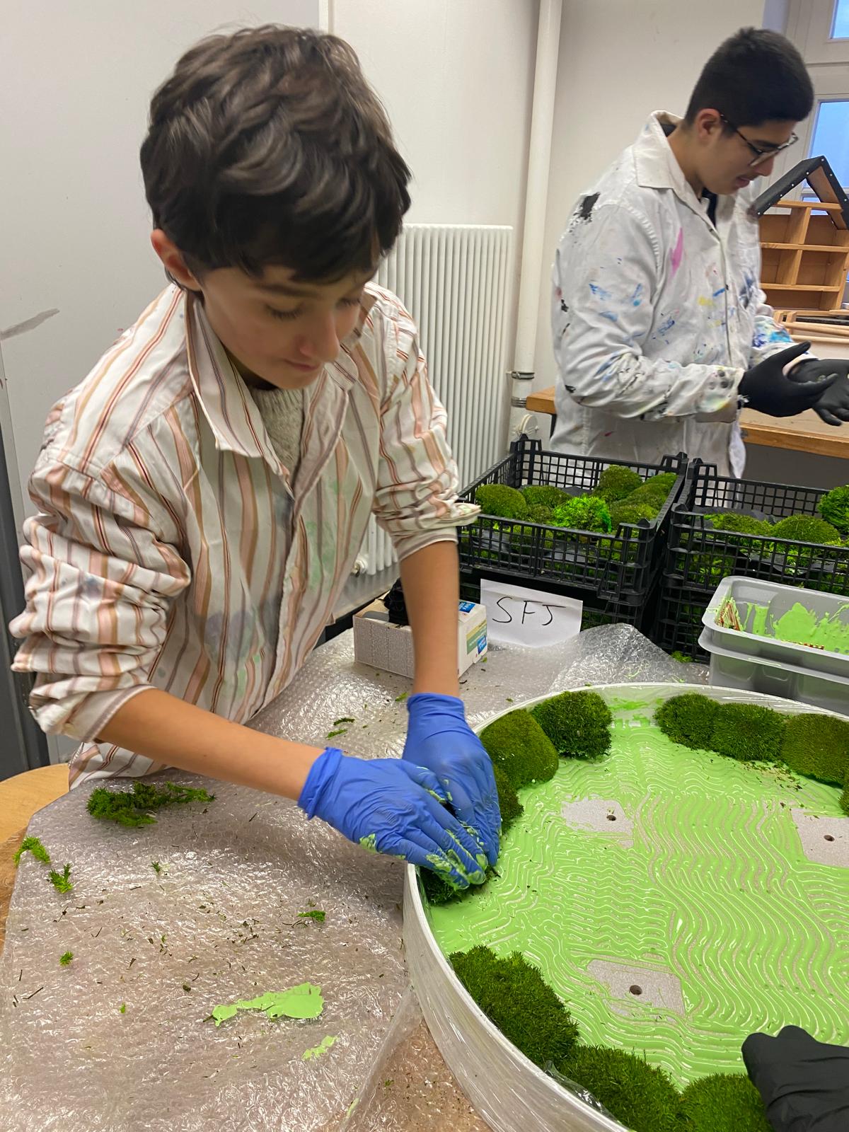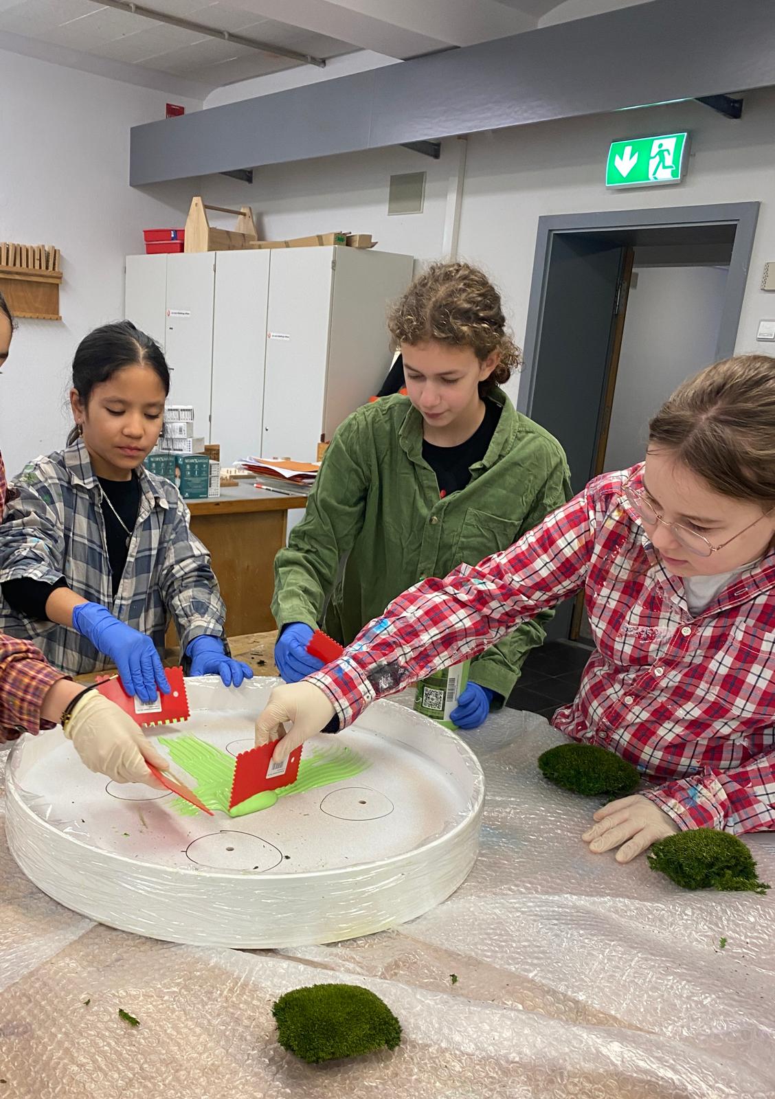 An einem Freitag kamen die beiden Künstler Emily Mazur und Anselm Stählin mit dem Material zu uns in die Schule. Die Schülerinnen und Schüler durften nach einer Erklärung die verschiedenen Moose dann auf die vorbereiteten Holzkreise kleben.